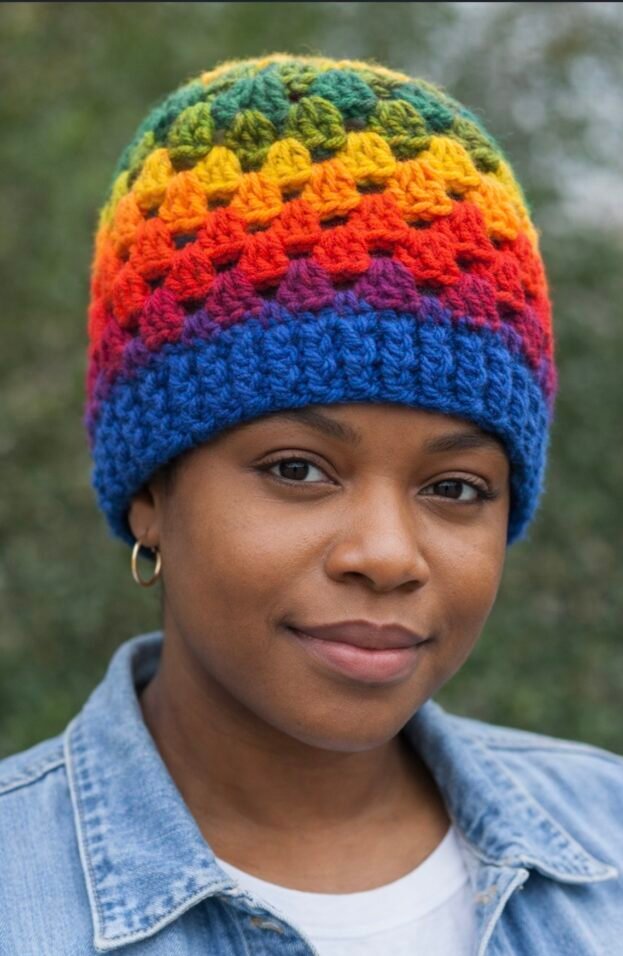 Add a pop of color to your cold-weather wardrobe with this beautifully handcrafted rainbow crochet beanie. Made with care and attention to detail, this hat features rich, vibrant stripes and a textured stitch pattern that’s both cozy and eye-catching.